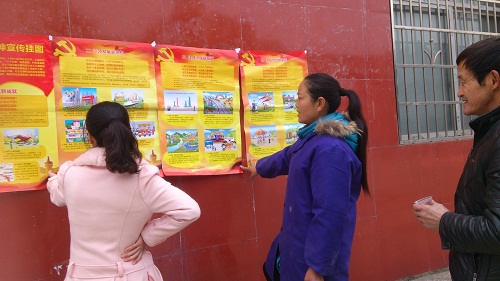 在镇政府观看宣传栏内十八大精神宣传挂图的一位群众说,她每天都路过政府去农贸市场买菜,对宣传栏里张贴的十八大精神挂图也非常关注,特别是对惠及百姓新举措“劳有所得就业广,学有所教重公平。病有所医保障全,老有所养夕阳红。住有所居天伦乐,美丽中国好前景”深有感触。